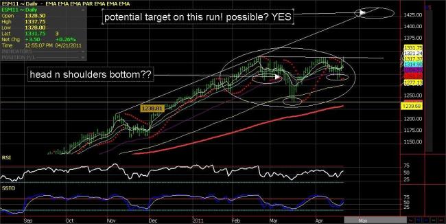 What I'm displaying here is a potential head and shoulders bottom. One of the oldest and hardest formations to find but this picture fits the mold. Why? The head is defined by the low @ 1241.25 (March 17th low). The left and right shoudlers are almost symmetrical 1287.75 (Feb 24th low) and 1290.25 (Monday's low) and the neckline runs straight across the flat top@ 1336.00-1338.00. With a close above the neckline this will potentially open the door for much higher prices and ultimately to 1436 in the JUNE S&P. I don't know what fundamental news takes us there but one should be buying dips and looking for higher prices. Does that mean its going to go in a straight line and hit the target? NO. In fact, inside the potential head and shoulders bottom we have a potential "sell signal" on the hourly chart . This sell signal should offer us a level to get "LONG" this market and ride it through the neckline.